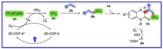 Based on controlled experiments and previous related studies, a plausible response mechanism for this heterogeneous visible light-induced three-component system is outlined in Scheme 20 [65]. First, 2D-COF-5* is excited by blue LED irradiation and activates oxygen in air to 1O2 via energy transfer (ET). Then, the singlet oxygen oxidises CF3SO2Na to produce the CF3 radical 5h, with simultaneous loss of SO2. Simultaneously, O2•− is produced via single electron transfer (SET). Subsequently, the CF3 radical is trapped by the olefin to produce the carbon radical intermediate 6h. Intermediate 6h then undergoes regioselective addition at the C3 position of quinoxalin-2(1H)-one 1h to provide the free radical intermediate 7h. Finally, hydrogen atom abstraction (HAT) occurs between intermediate 7h and O2•− to provide the desired product 4h.