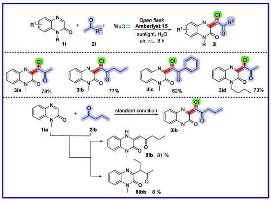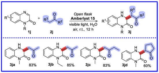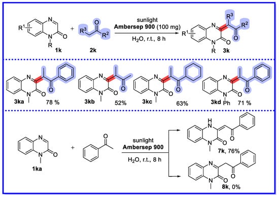 The selectivity of the reaction of quinoxalin-2(1H)-one, another asymmetric aliphatic ketone, with ion-exchange resins is highly dependent on the type of ion exchange resin as well as on the stability of the enolisation and the site resistance. Amberlyst 15 reacts readily with ketones with few substituents at the α-position to form 3j, whereas Ambersep 900 reacts readily with ketones with many substituents at the α-position to form 3k.
