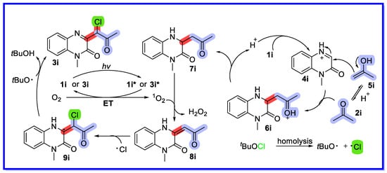 Based on previous reports and the results of control experiments, a reasonable mechanism has been proposed (Scheme 22) [70]. First, protonation of substrate 1a with protonic acid provides an iminium ion 4i, which reacts with the enol form 5i to provide the intermediate 6i. Intermediate 6i is then converted by deprotonation to the Mannich-type product 7i. Meanwhile, the starting material 1i (or 3i) is excited by sunlight to form the excited species 1i* (or 3i*), which acts as a photocatalyst to undergo an energy transfer (ET) process with triplet oxygen (3O2) to provide singlet oxygen (1O2) together with reformation of the ground state 1i. The Mannich-type product 7i is oxidised to compound 8i by an oxidative dehydrogenation process enabled by singlet oxygen (1O2). The chlorine radical (Cl•) generated by the homolysis of tBuOCl then attacks compound 8i to provide intermediate 9i. The final product 3i is obtained by oxidation of the intermediate 9i in the presence of tert-butoxy (tBuO•). The corresponding product can act as a photosensitiser to produce singlet oxygen (1O2).