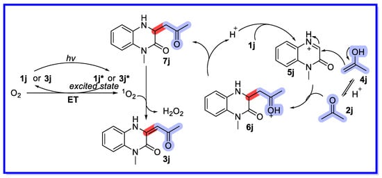 Based on mechanistic studies and previous reports, a plausible mechanism for this reaction is proposed in Scheme 24 [71]. In this conversion, Amberlyst 15 acts as a protonic acid to catalyse a Mannich-type reaction. First, acetone 2j is converted to the enol form 4j, which is then attacked by the protonated imine 5j to provide the intermediate 6j. The Mannich-type product 7j is then formed by deprotonation of intermediate 6j. Finally, the reaction undergoes two SET processes with the singlet oxygen 1O2 to provide the target product together with H2O2 (detected by hydrogen peroxide test paper). Intermediate 7j and the resulting product 3j can be used as photocatalysts to facilitate the photocatalytic cycle.