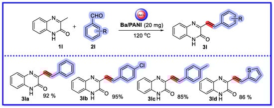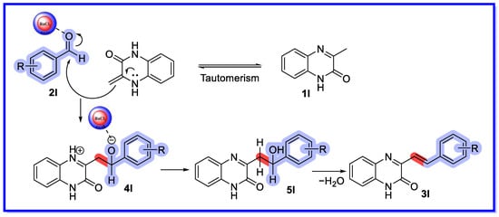 A mechanism for the synthesis of 3-substituted styrylquinoxalin-2(1H)-ones can be proposed based on reports in the literature (Scheme 28) [73]. Ba/PANI acts as a Lewis acid and activates the carbonyl group of the aldehyde (2l), thereby facilitating the nucleophilic attack of 3-methylquinoxalin-2(1H)-one (1l) through the intermediate 4l to provide the intermediate 5l. Finally, 5l is dehydrated to provide the desired product 3l.
