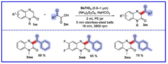 - He, Y.; Wang, G.; Hu, W.; Wei, D.; Jia, J.; Li, H.; Yuan, B. Piezocatalyzed Decarboxylative Acylation of Quinoxalin-2(1H)-ones Using Ball Milling. ACS Sustain. Chem. Eng. 2023, 11, 910–920. [Google Scholar] [CrossRef]