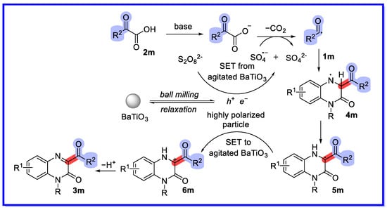 In 2023, Yuan’s group developed the first piezochemically-driven decarboxylation coupling of C–H bonds (Scheme 29) [74]. Stirring BaTiO3 by ball milling converts mechanical energy into electrical potential, leading to the production of benzoyl radicals via a single electron transfer pathway similar to photocatalytic reactions. This mechanical redox BaTiO3-catalysed synthesis of C3 acylated quinoxalin-2(1H)-ones using α-oxocarboxylic acids as acylation reagents is a solvent-free strategy with short reaction times and simple operation, and has promising applications in large-scale chemical production. In addition, BaTiO3 can be reused three times under optimal reaction conditions without significant loss of product yield. To further investigate the piezoelectric effect, the authors carried out SEM and XRD analyses of BaTiO3 samples from the first, second, third, and fourth cycles. SEM showed that after the first cycle BaTiO3 grains began to break down into smaller sizes with irregularities on the grain surface. The size of the secondary grains continued to decrease. After the third cycle, the size of these loose soft agglomerates increased significantly. XRD showed that the diffraction peak of BaTiO3 decreased with an increasing number of cycles, while the lattice parameters did not change significantly. This was in agreement with the SEM results. Hu and colleagues reported a reaction of the same type involving the silver-catalysed decarboxylation of α-oxocarboxylic acids with quinoxalin-2(1H)-ones to provide 3-acylquinoxalin-2(1H)-one derivatives. Compared to this reaction, the ball milling reaction is more environmentally friendly, as it is solvent-free [75].