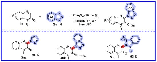 Based on the experimental results, the reaction mechanism in Scheme 32 was proposed [76]. First, ZIS-1 absorbs photons and produces electrons in the conduction band (CB) and causes holes in the valence band (VB). The positive oxidation potential makes it suitable for reaction with pyrazole (2n) to produce an N-centred pyrazol-1-yl radical cation 4n via single electron transfer (SET). At the same time, the electrons in CB are transferred to O2 (air) by SET, producing a superoxide radical (O2•−). Then, 4n is deprotonated by O2•− to form the hydrogen peroxide radical (HO2•) and the N-radical intermediate 5n. The N-radical intermediate 5n is then incorporated into the C=N bond of quinoxalin-2(1H)-one 1n to provide the intermediate 6n, followed by 1,2-H migration to provide the carbon-centred radical intermediate 7n. Next, 7n is oxidised by HO2 via the SET pathway to produce the radical cation intermediate 8n. Finally, the cation 8n undergoes deprotonation to produce the desired product 3n, while hydrogen peroxide (H2O2) is formed and can be detected by KI.