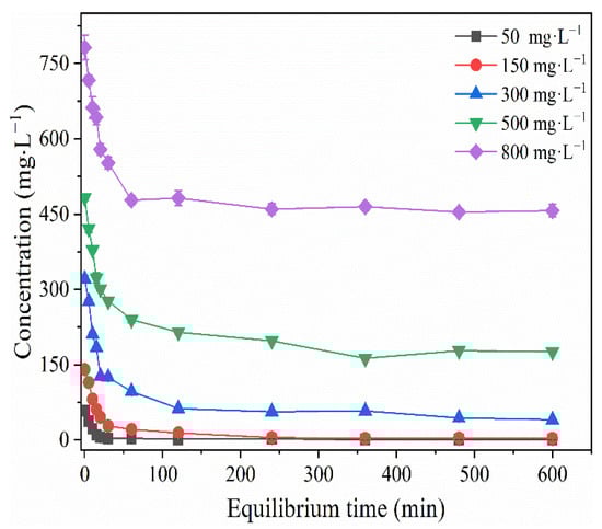 When the initial Cu(II) concentration was 50 mg·L−1, the adsorption of Cu(II) by the BLA was complete and reached equilibrium within 120 min. Moreover, the removal rate was 97.1%. When the initial Cu(II) concentration was 150 mg·L−1, it took 240 min to reach equilibrium. At initial Cu(II) concentrations of 150, 300, 500, and 800 mg/L, the removal rates after 240 min were 96.1%, 82.3%, 59.0%, and 41.2%, respectively. When the adsorption dose of lignite was constant, the removal rate decreased as the Cu(II) concentration increased. The Cu(II) adsorption rate in the initial 30 min was fast, owing to the availability of active centers on the BLA that quickly captured the heavy metal ions. The maximum Cu(II) adsorption capacity at equilibrium was approximately 65.0 mg·g−1. The Cu(II) adsorption capacity of the BLA was much higher than that of raw lignite. The maximum adsorption capacity was three times greater than that reported by Jellali et al. for Cd(II) and Cu(II) using raw lignite from the Cap Bon region (northeastern Tunisia) [27]. Moreover, it was approximately 16 times greater than that reported by Milicevic for Cu(II) using low-cost adsorbent Kolubara lignite [21]. However, it was lower than the value reported by Havelcova for Cu(II) using raw lignite [17].