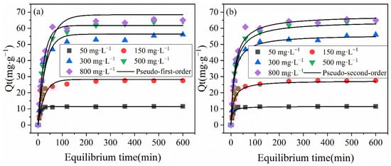 To explore the adsorption properties of BLA for heavy metal ions, the removal capacity was investigated for initial Cu(II) concentrations between 50 and 800 mg·L−1 at pH 6.0 and T = 24 ± 1 °C. The results are shown in Figure 1. Then, the first-order reaction kinetic and pseudo-second-order reaction-rate models were used to simulate the adsorption process. The dynamic simulation results are shown in Figure 2a,b.
