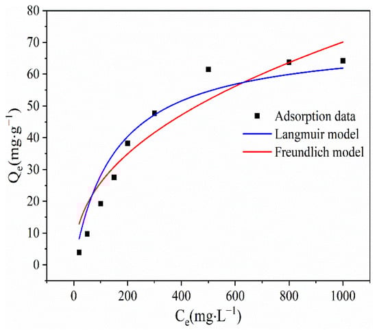 To study the thermodynamic adsorption characteristics of the BLA, adsorption isotherm studies were conducted for Cu(II) with ion concentrations ranging from 20 to 1000 mg·L−1. The other conditions were the same as those used to investigate the adsorption kinetics. For these tests, the contact adsorption equilibrium time was set to 240 min because it was sufficient for the heavy metal ions to reach equilibrium in the kinetics experiments.