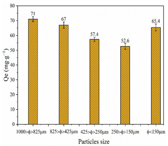 It is well known that adsorption is a surface phenomenon of solid adsorbents to surrounding molecules and ions and the particle size distribution of the adsorbent has a substantial effect on the adsorption properties. The effect of the size fraction on the Cu(II) adsorption was investigated under the following experimental conditions: initial Cu(II) concentration 500 mg·L–1, pH 6.0, 0.5 g of BLA, 240 min contact adsorption time, and room temperature (24 ± 1 °C). Figure 4 shows the relationship between the amount of Cu(II) adsorbed by the BLA and the particle size distribution. At the same time, BET adsorption specific surface area, adsorption pore volume, and pore size of BLA with different particle sizes are shown in Table 4. As the particle size decreased, the Cu(II) adsorption capacity first decreased and then increased. The greatest adsorption (71.0 mg·g−1) was observed at the greatest granulometry (1000 > Φ > 825 μm). When the particle size distribution was between 150 and 250 μm, the adsorption capacity was lowest (52.6 mg·g−1). This phenomenon can be explained by the BET adsorption specific surface area, adsorption pore volume, and pore size of BLA displayed in Table 4, With the decrease in particle size, the specific surface area, adsorption pore volume, and pore size all tend to decrease, Therefore, For the adsorbents dominated by mesoporous adsorption, the adsorption capacity decreases with the decrease in specific surface area.