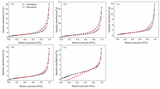 Furthermore, when the particle size was less than 150 μm, the adsorption capacity was 65.4 mg·g−1. The adsorption capacity suddenly increases, which may be related to the change in adsorption mode. The BET low-temperature N2 adsorption isotherms of BLA with different particle sizes are shown in Figure 5. The results showed that the hysteresis isotherm of the BLA sample has no obvious saturated adsorption platform, indicating that the pore structure is very irregular, mainly medium pores and large pores, and contains fewer micropores. With the decrease in the particle size of lignite, it is easier to be dissolved by microorganisms, the pore structure formed by excessive dissolution is less, and the adsorption of metal ions changes from mesoporous adsorption to lamellar adsorption. In addition, this may be because, after microbial dissolution and transformation, the lignite with larger particles had more adsorption pores and a greater pore volume. If the particle size is large, then the pore solution and pore distribution dominate the adsorption process; however, if the particle size is small, then more active sites are exposed and the specific surface area dominates the adsorption process.