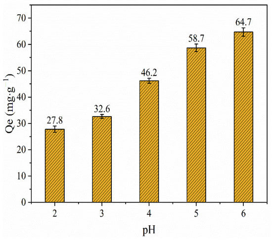 Metal cations in aqueous solution form different hydrolysis products, and the cations exist in different forms depending on the solution pH. When the pH is low, copper ions exist as Cu(II), and when the pH is high they exist as Cu(OH)+ and Cu(OH)2(s). Therefore, the pH of the experimental solution system was kept between 2 and 6 for this part of the study. In addition, the experiment was conducted with an initial Cu(II) concentration of 500 mg·L−1, 0.5 g of BLA, particle size of <150 μm, contact time of 240 min, and at room temperature (24 ± 1 °C).