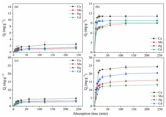It is important to understand the adsorption characteristics of transformed lignite adsorbents with different heavy metal ions. Therefore, mixed ionic solutions of Cu(II), Mn(II), Hg(II), and Cd(II) with different concentrations (50 and 150 mg·L−1) were used to investigate the selective adsorption characteristics of raw lignite and the BLA. The solutions were prepared and left to reach equilibrium for 24 h. Then, 100 mL of the mixed ionic liquid was transferred to a 250 mL glass flask for the adsorption test. A contact time of 240 min was selected, the pH was 6.0, and samples were taken at different times to determine the concentration of the residual heavy metal ions in the solution. The experimental results are shown in Figure 7.