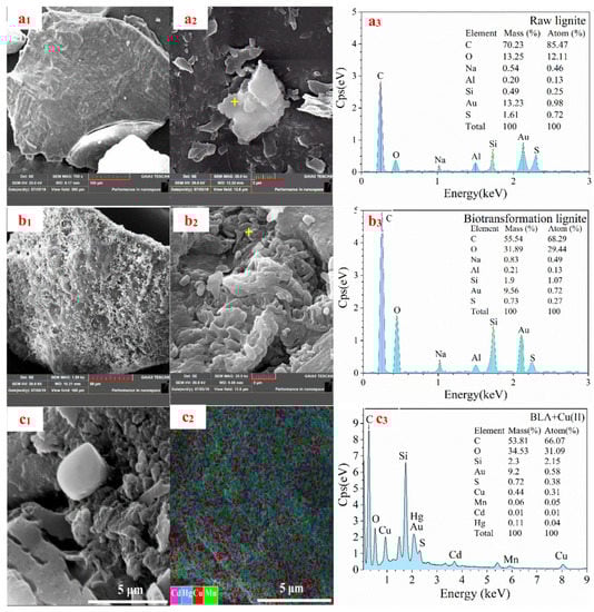 The surface of the raw lignite was smooth with few pores and cracks (Figure 8a1,a2). In contrast, the surface of the BLA was rough with many dissolved pored and attached microbial cells (Figure 8b1,b2). This explains the increase in the specific surface area. Thus, it may be concluded that during treatment part of the lignite structure is degraded and dissolved by the microorganisms, which forms pores on the surface, increases the specific surface area, and exposes active adsorption groups. This was confirmed by the EDS results, as shown in Figure 8a3,b3,c1–c3. The carbon, oxygen, and sulfur contents of raw lignite were 70.23%, 13.25%, and 1.61%, respectively. After microbial treatment, these values were 55.54%, 31.89%, and 0.73%, respectively. At the same time, the EDS map scanning result showed LAB could adsorb heavy metal ions very well, and the adsorption capacity of Cu(II) was the strongest among the four ions. The results were consistent with the experimental results of heavy metal adsorption.