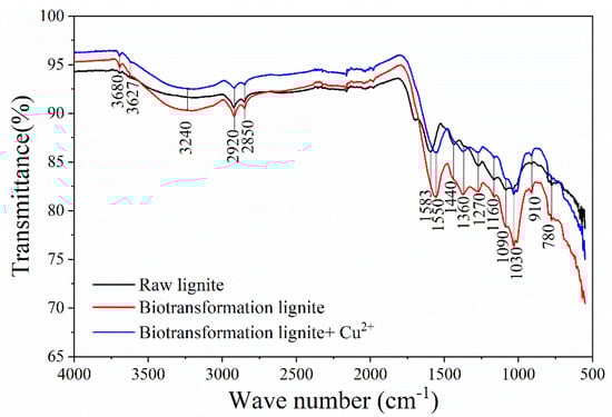To investigate the mechanism by which the BLA adsorbed heavy metal ions, FTIR analysis was conducted before and after Cu(II) adsorption. To illustrate the effect of microbial transformation on the adsorption of heavy metal ions, raw lignite was also analyzed. All the FTIR results are shown in Figure 9.