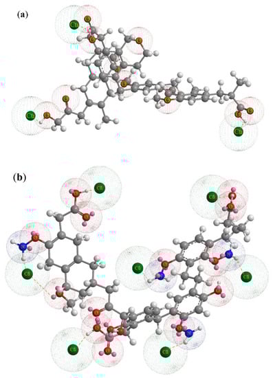 Model of Cu(II) adsorption by the basic structural unit of lignite and BLA. (a): Simulation diagram of Cu(II) adsorption by basic structural unit of raw lignite; (b): Basic structure model of BLA adsorption simulation diagram of Cu(II)).