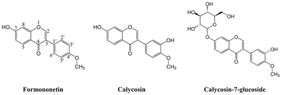 Radix Astragali, one of the most popular traditional Chinese herbal medicines, has been widely used in health foods and dietary supplements to enhance immunity and treat diseases for thousand years in China [6,7]. Several studies have indicated that Radix Astragali has various pharmacological functions, including antitumor [8], antioxidation [9], anti-inflammation [10], and neuroprotection [11], which are highly correlated with its bioactive components. Isoflavonoids, as a subclass of flavonoids, including formononetin, calycosin, and its glucoside, named calycosin-7-glucoside (Figure 1), are important bioactive constituents of Radix Astragali and contribute to multiple biological activities of Radix Astragali [12]. They are often used as standard components for the quality evaluation of Radix Astragali. In recent years, many advanced technologies in experiments have been adopted to extract and separate bioactive components from Radix Astragali [13,14]. Interestingly, formononetin, calycosin, and calycosin-7 glucoside were found to be active against free radicals as evaluated by DPPH radical scavenging activity and oxygen radical absorbance capacity (ORAC) assays, exhibiting excellent antioxidant activity [15,16,17,18].