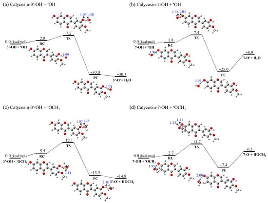 Apart from the thermodynamic approach, in order to obtain further insights into the free radical scavenging activity of the antioxidants, we performed a systematic study on the reaction pathway of calycosin with different ROS such as hydroxyl (•OH) and methoxy (•OCH3) radicals via the HAT mechanism. Table 2 summarize the reaction kinetics and thermodynamics of the O3′ and O7 positions of calycosin with •OH/•OCH3 radicals. Here, to better understand the H donation process, the potential energy surfaces (PES) were calculated for the reactions between •OH/•OCH3 and the different sites of calycosin, correspondingly (Figure 3). The rate constants were also calculated using the KiSThelP 2019 program [44], which are useful criteria for identifying the most efficient compounds for scavenging radicals. All calculations were performed in the gas phase at the M06-2X/6-311 + G(d,p) level.
