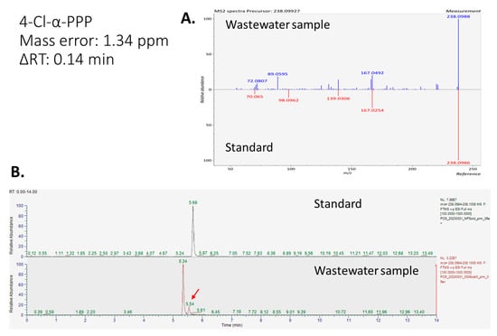 Identification result of 4-Cl-α-PPP based on standard matching. (A) MS/MS matching result of 4-Cl-α-PPP between standard in solvent mixture and signal in wastewater sample. (B) Extract ion chromatograms of 4-Cl-α-PPP in solvent mixture and wastewater sample.
