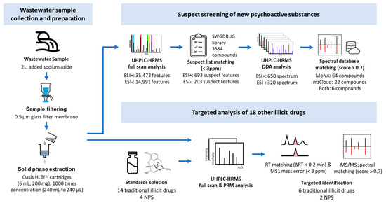 In this study, a targeted and suspect screening strategy was employed to identify illicit drugs and NPSs in wastewater samples. To obtain a sewage sample that is representative, we consulted the published literature [6,34,35] to design the processes for sample pretreatment and data analysis. The study design and number of filtering features at each step are presented in Figure 3.