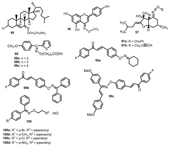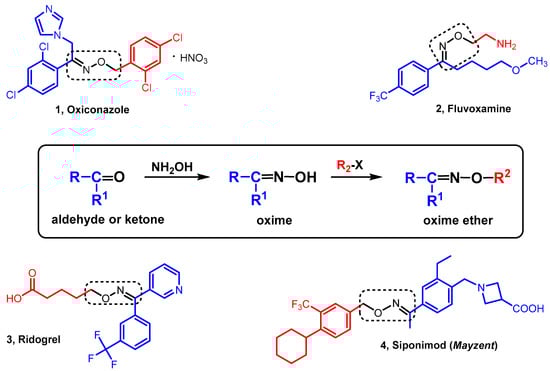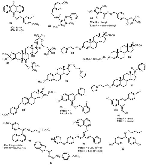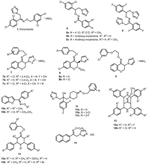 Oxime ethers are a class of compounds containing the >C=N-O-R moiety. They are formed in the reaction of oxime (ketones or aldehydes derivatives) with alkyl or aryl halogen. The formation of an oxime ether moiety is one way to combine different structural elements into one molecule. This gives the possibility of composing compounds that exhibit various biological activity. The literature presents many oxime ether compounds with diverse biological activity. The characteristic ether moiety of the oxime is a structural element in the molecules of known drugs. An example is oxiconazole (1)—an antifungal drug in the form of a salt (nitrate(V)) (Figure 1). It is an acetophenone-oxime derivative of the basic imidazole structural unit (substituted heterocyclic ring with a nitrogen in the 3-position). It is applied to the skin in the form of an ointment, cream or powder []. Fluvoxamine (2) is an antidepressant which functions pharmacologically as a selective serotonin reuptake inhibitor. It is a derivative of (E)-5-methoxy-1-(4-(trifluoromethyl)phenyl)pentan-1-one oxime recently also used in the treatment of COVID-19 []. Ridogrel (3)—an oxime ether derivative of (E)-pyridin-3-yl(3-(trifluoromethyl)phenyl)methanone—is an orally active, potent and specific combined thromboxane synthase inhibitor and thromboxane A2 receptor (thromboxane/prostaglandin endoperoxide receptor) antagonist. It is a dual-action drug useful for the prevention of systemic thrombo-embolism and as an adjunctive agent to thrombolytic therapy in acute myocardial infarction []. Siponimod (4), a benzyl ether derivative of (E)-1-(2-ethyl-4-(1-(hydroxyimino)ethyl)benzyl)azetidine-3-carboxylic acid, Mayzent® is a sphingosine 1-phosphate receptor modulator indicated for the treatment of relapsing forms of multiple sclerosis (MS), to include clinically isolated syndrome, relapsing-remitting disease and active secondary progressive disease, in adults. It works by reducing the number of lymphocytes in the peripheral blood to minimize the migration of lymphocytes into the central nervous system []. The presence of the oxime ether group in drugs used in various diseases is an incentive to search for new compounds containing this structural fragment and to study their various biological activities. The oxime ethers have been tested, among others, in order to assess their antifungal, antibacterial, antidepressant, anti-inflammatory, anticancer and other activities. This manuscript is a review of the activity of various oxime ethers. To the best of our knowledge, this is the first listing of the activity of compounds containing such a moiety. The subject matter of this review is important, interesting and necessary. It fills a certain thematic gap devoted to the biological activities of the oxime ethers. At the same time, it expresses research interest in this class of compounds in a specific way, and it also indicates the scientific potential of the presented chemical structures and their biological activities.