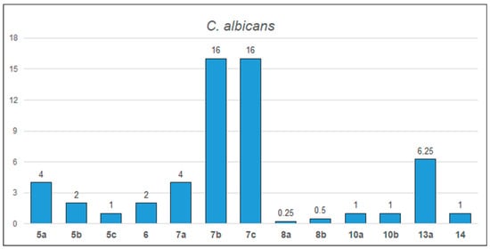 A summary of the antifungal activity of the selected oxime ethers is presented in Figure 3 and in Tables S1 and S2 in the Supplementary Materials. The largest group of compounds was tested against C. albicans. Compound 8a has the lowest MIC value. (Figure 3). However, among the described group of the oxime ethers, compounds 11a–11c showed the strongest antifungal activity, of which compound 11a (expressed as MIC80) was the most active (Table S1, Supplementary Materials).