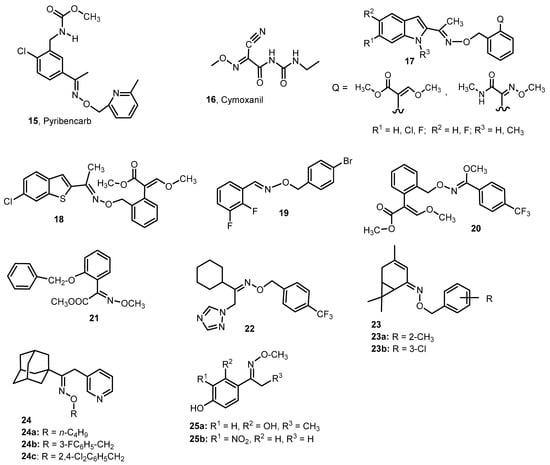 The oxime ethers were also tested for their use as fungicides in plant protection. Pyribencarb (15) is an oxime ether and is a fungicide used against a wide range of plant pathogenic fungi, especially gray mold caused by Botrtis cinerea and Sclerotinia sclerotirum stem rot (Figure 4) [].