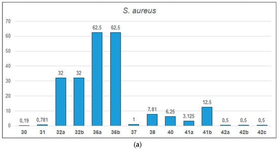 A summary of the antibacterial activity of selected oxime ethers is presented in Figure 6 and in Table S3 (Supplementary Materials). Compound 30 is most active against S. aureus. Compounds 30 and 31 showed the greatest activity against Gram-negative bacterial strains E. coli and K. pnaumoniae. Only compound 40 significantly inhibited the growth of the bacterial resistant strain of P. aeruginosa.