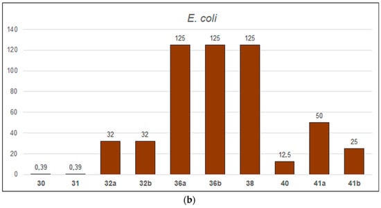 Minimal inhibitory concentrations (MIC, µg/mL) of the selected oxime ethers against (a) S. aureus and (b) E. coli bacterial strains.