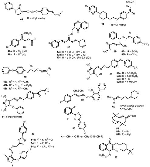 Li et al. [] studied the activity of 26 oxazoline derivatives containing an oxime ether moiety 55 against T. cinnabarinus. These compounds contained various substituents, mainly aromatic and alicyclic. All compounds tested were 100% effective at a concentration of at least 0.01 mg/mL on eggs of T. cinnabarinus and at a concentration of 0.001 mg/mL on larvae of T. cinnabarinus. In both cases, these values were significantly better than those obtained for etoxazole (100% effectiveness at a concentration of 1 mg/mL).