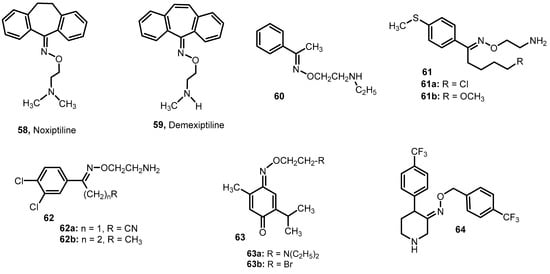 Other antidepressants containing an oxime ether group are dibenzocycloheptadiene derivatives: noxiptyline 58 [,] and demexiptyline 59 [] (Figure 8). These compounds belong to the group of tricyclic antidepressants and are characterized by reduced anticholinergic activity and low cardiotoxicity [].