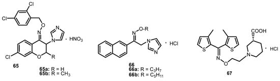Emami et al. [] evaluated the anticonvulsant activity of (Z) and (E)-ethers of imidazolylchromanone oxime in a test of convulsions induced by subcutaneous administration of pentylenetetrazol (PTZ) in animals. Seizures caused by the injection of PTZ at 30 mg/kg were significantly delayed by O-(2,4-dichlorobenzyl) oximes, but the stereoisomers of (Z)-7-chlorochromanone-O-(2,4-dichlorobenzyl) oximes 65a and 65b (Figure 9) were the most effective, after which seizures occurred only after 715 and 776 s, respectively, and their duration was 40 and 34 s, while for the control group, these values were: 264 (seizure delay) and 52 (seizure duration) seconds. Analyzing the test results, it can be concluded that the substitution of the chlorine atom in the 7-positions and/or the methyl group in the 2-positions of the chroman ring was responsible for the activity of the O-(2,4-dichlorobenzyl)oxime derivatives. There were no significant differences in the anticonvulsant effect between the (E) and (Z) isomers of the tested compounds [].