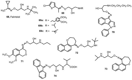 A drug with an oxime ether group, which is a strong β-adrenergic antagonist, is falintolol (68) (Figure 10) []. Falintolol is a beta-adrenergic receptor antagonist. Falintolol does not produce any noteworthy side effects and is capable of being an effective beta-blocking agent in open-angle glaucoma therapy [].