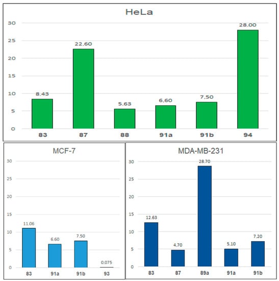 In turn, Alam et al. [] studied three derivatives containing an ether group in position 7 of the steroid system. These compounds 33a–c showed activity against the Gram-positive (B. subtilis, S. pyogenes and S. aureus) and the Gram-negative bacteria (E. coli, P. aeruginosa, K. pneumonia) comparable to chloramphenicol.