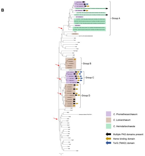 The phylogenetic reconstruction suggested that four groups of sensor kinases could be identified in the two datasets, where C. Prometheoarchaeum displayed two sets of proteins, one closer to bacterial homologs and another as an outgroup sharing homology with C. Heimdallarchaeota sensor kinases (Group A). Additionally, upon combining the data from the Conserved Domain Search and complementing the information with ScanProSite [15,16] (Supplementary Figure S1), kinases from Group C showed the most varied domains, including more than one PAS domain.