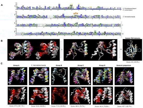 The high number of sensor kinases containing a PAS domain was intriguing. Close inspection of the sequences revealed that all the PAS domains (catalytic and accessory domains listed in Supplementary File S1) showed the characteristic conserved residues of bacterial PAS domains (Figure 3A). In contrast, a comparison of the PAS domains of eukaryotic proteins showed less conserved residues than their bacterial or Asgardian counterparts. Individually modeled domains showed that the overall folding was similar among bacterial PAS domains. Still, in the case of the eukaryotic domains, the folding was different from that of the bacterial domains. The PAS domains from human proteins and those with experimentally determined structures showed an overall conserved architecture with low sequence identity. These domains were too divergent from bacterial and other PAS domains from fungi and flies (Figure 3B). Structural comparison (Figure 3C) for each group revealed that the PAS domain had a similar structure in all instances, and the same regions were conserved. Comparing two members of each category revealed that the PAS domain was highly divergent when eukaryotic counterparts were included, but the structure was highly conserved. This suggests that the PAS domains in Groups A and C. heimdallarchaeota are conserved and closely related to bacterial PAS domains.