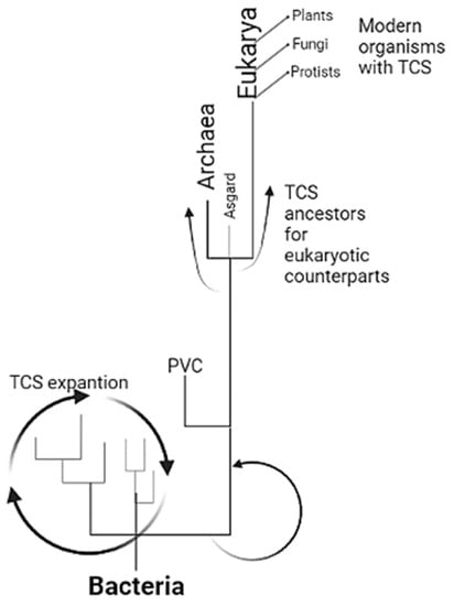 The theoretical model is presented here for expanding TCSs from bacteria to eukaryotes. TCS is the paradigm of signal transduction in bacteria, diversified and vastly expanded in all groups. In the diversification and specialization with environmental restrictions imposed when photosynthetic organisms modified the atmosphere, many organisms relied on anoxic environments, where PVC bacteria may have been enriched and began the specialization of TCSs. This group selected sensor kinases for those with special characteristics that led to overspecialization, resulting in the sensor kinases found in Archaea and Asgard. With eukaryogenesis, TCSs from Asgardian archaea were inherited and further diversified in protists, fungi, and plants, suggesting perhaps several individual attempts that finally worked and established the eukaryotic organisms found today. The scheme was created with BioRender.com, accessed on 1 February 2023.