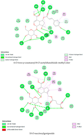 6-O-trans-p-coumaroyl-8-O-acetylshanzhiside methyl ester, 10-O-succinoylgeniposide, Loganic acid 6′-O-beta-d-glucoside, 6-O-trans-cinnamoyl-secologanoside, Loganic acid, 6′-O-trans-para-coumaroyl geniposidic acid, Amphicoside, and Sotorasib were selected for MM/PBSA analysis. The MM/PBSA analysis data showed maximum binding energy by 6-O-trans-p-coumaroyl-8-O-acetylshanzhiside methyl ester (−7.309 kJ/mol), followed by 6′-O-trans-para-coumaroyl geniposidic acid (−6.153 kJ/mol) and 6-O-trans-cinnamoyl-secologanoside (−4.971 kJ/mol) (Table 2) [19].