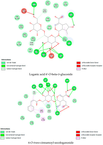 Molecular docking interaction data for 6-O-trans-p-coumaroyl-8-O-acetylshanzhiside methyl ester, 10-O-succinoylgeniposide, Loganic acid 6′-O-beta-d-glucoside, 6-O-trans-cinnamoyl-secologanoside, Loganic acid, 6′-O-trans-para-coumaroyl geniposidic acid, Amphicoside, and Sotorasib.