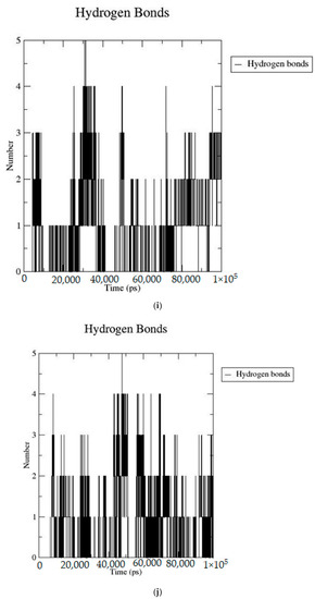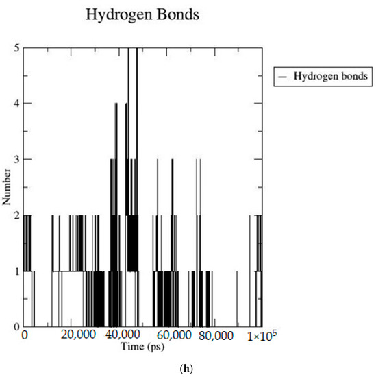 Based on the docking scores, 6-O-trans-p-coumaroyl-8-O-acetylshanzhiside methyl ester, 10-O-succinoylgeniposide, Loganic acid 6′-O-beta-d-glucoside, 6-O-trans-cinnamoyl-secologanoside, Loganic acid, 6′-O-trans-para-coumaroylgeniposidic Acid, Amphicoside, and Sotorasib were selected for the 100 ns MD simulation study. As per the molecular dynamic simulation data from the iridoids and 8AFB receptor, the average RMSD values for 6-O-trans-p-coumaroyl-8-O-acetylshanzhiside methyl ester, 10-O-succinoyl geniposide, Loganic acid 6′-O-beta-d-glucoside, 6-O-trans-cinnamoyl secologanoside, Loganic acid, 6-O-trans-coumaroylgeniposidic acid, Amphicoside, and Sotorasib were 0.12, 0.11,0.13,0.16,0.11, 0.12, 0.15, and 0.11, respectively (Figure 2a). In the RMSF data, some observable fluctuations were identified near 500, 1000, and 1800 atoms, with maximum fluctuations within 0.25 nm, except 6-O-trans-cinnamoyl secologanoside, which showed a sudden surge in values up to 0.42 nm (Figure 2b). The radius of gyration values for 6-O-trans-p-coumaroyl-8-O-acetylshanzhiside methyl ester, 10-O-succinoyl geniposide, Loganic acid 6′-O-beta-d-glucoside, 6-O-trans-cinnamoyl secologanoside, Loganic acid, 6-O-trans-coumaroyl geniposidic acid, Amphicoside, and Sotorasib were within ranges of (1.44–1.49), (1.45–1.49), (1.45–1.50), (1.45–1.49), (1.45–1.50), (1.45–1.50), (1.44–1.49), and (1.14–1.27), respectively (Figure 2c). The average SASA values of 6-O-trans-p-coumaroyl-8-O-acetylshanzhiside methyl ester, 10-O-succinoyl geniposide, Loganic acid 6′-O-beta-d-glucoside, 6-O-trans-cinnamoyl secologanoside, Loganic acid, 6-O-trans coumaroyl geniposidic acid, Amphicoside, and Sotorasib were 89.59 nm2, 90.60 nm2, 91.03 nm2, 90.55 nm2, 90.48 nm2, 89.97 nm2, 90.91, and 90.90 nm2, respectively (Figure 2d). The hydrogen bond analysis of 6-O-trans-p-coumaroyl-8-O-acetylshanzhiside methyl ester (Figure 2e), 10-O-succinoyl geniposide (Figure 2f), Loganic acid 6′-O-beta-d-glucoside (Figure 2g), 6-O-trans-cinnamoyl secologanoside (Figure 2h), Loganic acid (Figure 2i), 6-O-trans coumaroyl geniposidic acid (Figure 2j), Amphicoside (Figure 2k), and Sotorasib (Figure 2l) showed that 251, 250, 254, 250, 251, 251, 250, and 246 hydrogen bond donors and 497, 497, 499, 496, 494, 496, 497, and 493 hydrogen bond acceptors were present in the interactions. The coulombic short-range:protein–ligand energies (kJ/mol) for 6-O-trans-p-coumaroyl-8-O-acetylshanzhiside methyl ester, 10-O-succinoyl geniposide, Loganic acid 6′-O-beta-d-glucoside, 6-O-trans-cinnamoyl secologanoside, Loganic acid, 6-O-trans coumaroyl geniposidic acid, Amphicoside, and Sotorasib were −30.52, −22.47, −21.20, −35.74, −41.27, −35.387, −13.98, and −21.32 respectively. The Lennard–Jonesshort-range:protein–ligand energies of the molecules were −24.00 kJ/mol, −47.71 kJ/mol, −30.30 kJ/mol, −27.82 kJ/mol, −45.18, −36.75, −25.85, and −106.351, respectively [18].