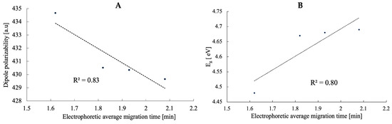 The molecular dipole moment is a basic property of a molecule that is used to investigate intermolecular interactions. An increase in the dipole moment raises the polar nature of a bond in a molecule. The DFT-calculated data indicate that the dipole moment of four vitamin D3 analogs was in the order PRI-2204 < PRI-2203 < PRI-2205 < PRI-2201. The highest dipole moments of PRI-2201 and PRI-2205 signified their strong intermolecular interactions. The dipole moment for PRI-2201 (μ = 4.23 Debye), larger than that of PRI-2205 (μ = 3.49 Debye), may be due to the presence of a strong electron donor–acceptor configuration in the molecule. As we noted earlier, dipole polarizability is a quantity of particular interest for structural chemistry. The molecular polarizability of a molecule characterizes the capability of its electronic system to be distorted by the external field, and it plays an important role in modeling many molecular properties and biological activities [44]. This parameter relates to how the susceptibility of system electrons can be influenced by the approaching charge. This is affected by several factors, such as the compound complexity, the size of the molecular systems, and the number of free electrons. Herein, the order of mean polarizability PRI-2205 > PRI-2204 > PRI-2203 > PRI-2201 suggests that the molecule PRI-2205 (αtotal = 434.66 a.u.) is the most polarizable; regardless, their differences are not very high. In addition, the theoretically determined dipole polarizability values were well correlated with the experimentally determined average electrophoretic migration times for a small set of data with four molecules (R2 = 0.83, Figure 3A), only. The correlation coefficient was high enough, proving the model’s predictive ability. Thus, the model is suitable for predicting the order of migration of vitamin D3 analogs in NACE.