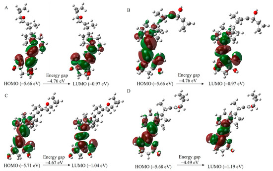 HOMO-LUMO diagram of PRI-2201 (A), PRI-2203 (B), PRI-2204 (C), and PRI-2205 (D). The positive (red) and negative (green) phase distributions represent the molecular orbital wave functions. HOMO (electron donor regions) determines the ionization potential. LUMO (electron acceptor regions) determines the electron affinity.