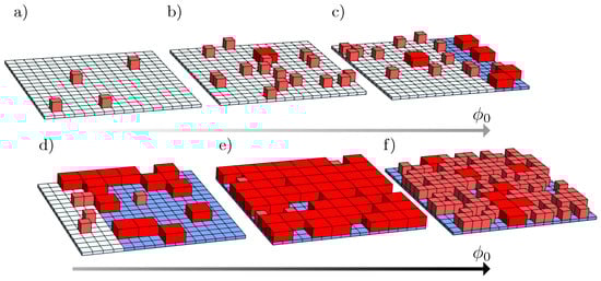 We consider a binary mixture of solvent molecules and a fixed number of particles. The particles can reside in two distinct states with different particle volumes: a smaller volume and a larger volume , with . Throughout this paper we use the index “S” and “L” to denote quantities related to particles in the small-volume and in the large-volume state, respectively. The numbers of particles in each state, and , add up to the fixed total number . Assuming the particles are residing on a lattice of M equal sites, it is convenient to introduce the corresponding volume fractions and . Hence, the scaled number of particles is a fixed constant [7]; while lattice sites are occupied by the particles, the remaining sites are filled with solvent molecules. Here, we assume an S particle and a solvent molecule occupy one single lattice site each. More general cases with different volumes for solvent molecules and S particles are straightforward to implement. Figure 1 shows a schematic representation of a two-dimensional system of a square lattice composed of particles that can assume two distinct states: small (S, light red cubes) and large (L, dark red cuboids, with ). In the figure, we qualitatively illustrate a typical scenario of how the system may evolve upon increasing : from a single phase composed of S particles—diagrams (a) and (b)—to two coexisting phases, colored in white and blue, and each with distinct compositions and phase size—diagrams (c) and (d). By further increasing , as in diagram (e), the system exhibits a single phase composed mostly of L particles. Finally, for even larger , diagram (f) displays the lattice densely packed with S particles. The color gradient in the arrows indicates the increase in , with darker colors corresponding to larger values of . The study of how different choices of interaction parameters bring about this and similar phase behaviors is one of the main goals of this work.
