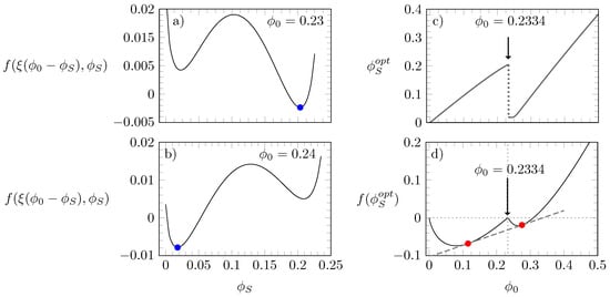Diagrams (a,b): free energy according to Equation (3), calculated as a function of for and ; blue bullets mark the global minimum. Diagram (c): as a function of . Diagram (d): as a function of with red bullets marking the points that connect through a common tangent. In all four diagrams, , and .