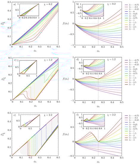 The results shown in Figure 2 correspond to a specific choice of the interaction parameters and . In order to account for other choices, we present in Figure 3 results for and versus for values ranging from to and three different choices of : in diagrams (a) and (b), in diagrams (c) and (d), and in diagrams (e) and (f). Recall that is the solution of Equation (4), thus being the value at which adopts a global minimum. The main diagrams magnify the region , whereas the insets display the results in the range ; all results in Figure 3 are obtained for , and the values are color-coded according to the legends on the side-panels. In diagrams (a) and (b)—top row—we observe that, irrespective of the values of , all distributions of are continuous, and the free energies exhibit a single minimum. For , increasing produces results that evolve from straight lines (purple and blueish curves) to distributions that tend to bend at (red and brown curves). For larger , as in panels (c) and (d), where , the -curves do not only bend but, for some values of , start to display a discontinuity analogous to that observed in Figure 2c. A similar behavior is also present in the bottom row of diagrams, but, as in this case is even larger (), the curves are discontinuous over a wider ranger of values; in both rows of diagrams we gray-shaded the area where the initial growth of is followed by a discontinuous jump to smaller values, and color-matching dotted lines are plotted as a visual guide for this change. For larger , the free energy displays two minima, which become more pronounced upon increasing ; for example, for , the larger the values of , the closer the minima to and to .