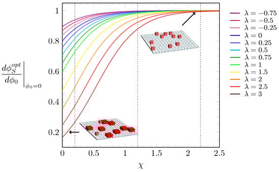 Upon increasing , starting from , the lattice becomes populated with particles either in the L-state or S-state. When is sufficiently large, the surface tension between the particles and the solvent results in the S-state dominating. Growing gives rise to an increasingly large number of particle–particle interactions that replace particle–solvent interactions. For , where the L-state is energetically preferred over the S-state, this may lead to a transition to a dense phase dominated by the L-state. Let us analyze which state, L or S, dominates in the limit of small . To this end, it is useful to calculate the slope of as a function of for fixed and . A linear relation is valid in the limit of small . Assuming in Equation (3) and expanding around , we arrive at the following solution for the slope s: