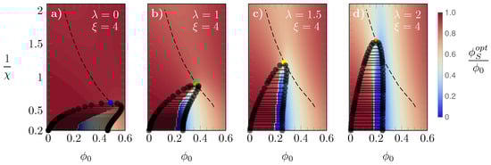 Phase diagrams, versus , for and different values of : , 1, , and 2 in panels (a–d), respectively. The critical value of is marked by colored bullets: blue (), green (), yellow (), and green (). The dashed line shown in all diagrams is the line on which all critical values lie. The “heat maps” in the background display the value of color-coded according to the side legend.