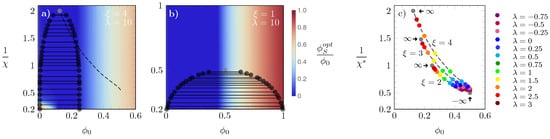 In order to investigate the effects of further increasing , in diagrams (a) and (b) of Figure 6 we show results obtained for and two different choices of : in (a) and in (b). The latter corresponds to the S-state and L-state having the same size, which leads to the same phase diagram as the regular Bragg–Williams free energy. Hence, in diagram (b), the critical point is , and , whereas for diagram (a), the location of the critical point is close to , and . More generally, in the limit of large , where the L-state is enforced, the critical point is located at and . To bridge between these limiting cases, in panel (c) of Figure 6 we display how the critical point and corresponding vary as a function of for different choices of (symbols are color-coded according to the side legend).