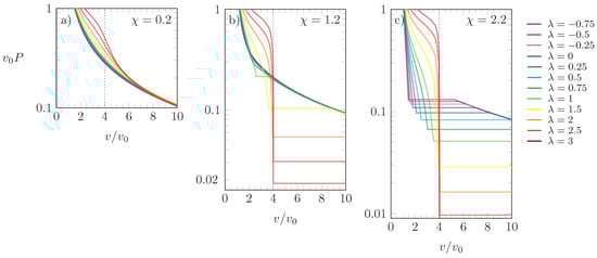 In Figure 7, we present isotherms for the scaled pressure as a function of for three different choices of : (a), (b), and (c). Different values of are color-coded according to the side legend, and all results were obtained for . Because corresponds to effectively attractive interactions between the particles, increasing always reduces P at fixed . Despite this, increasing at fixed does not always increase P, despite the growing preference for the L-state. The pressure tends to increase with for and for if . However, for and , increasing lowers the pressure of a phase-separated system because a larger degree of aggregation is induced that involves a smaller number of particles and, thus, a lower pressure.