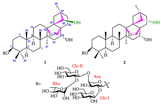 As a white, amorphous powder, compound 1 owned a negative optical rotation in MeOH, [α − 11.3 (c 0.1, MeOH). Its molecular formula was determined to be C53H86O22 via HR-ESI-MS (m/z 1097.5496 [M + Na]+, calculated for 1097.5503) (Figure S2). Absorbances (cm−1) at 3436 (OH), 1075 (C-O-C), and 2940 (CH3, CH2, and CH) were noted in the IR spectrum. In the 1H NMR spectrum (pyridine-d5, 500 MHz) (Table 1, Figures S3–S6), six tertiary methyls at δH 0.80, 0.98, 1.13, 1.23, 1.38, and 1.50, and a pair of geminal protons at δH 3.83 and 3.69 (each 1H, d, J = 8.0 Hz) were observed, which correlated with six methyl carbon resonances at δC 16.3, 16.4, 28.0, 21.3, 18.3, and 19.1, respectively, and an oxygenated methylene at δC 76.4 in HSQC (Figures S14–S16). In addition, a quaternary carbon resonance occurred at δC 88.9 in 13C NMR (Figures S7–S10). All these data were similar to 13,28-epoxyoleanane skeleton, except for the absence of a tertiary methyl [8]. An oxymethine, with a carbon at δC 81.0 and correlated with a proton at δH 4.55 in HSQC, was assigned to C-30 by the HMBC correlation of δH 4.55 with C-17 (δC 49.6), and correlations of δC 81.0 with H3-29 (δH 1.23), Ha-19 (3.38), and Ha-21 (2.37), indicative of the presence of a 4/5/6 fused tricyclic skeleton formed through the linkage of C-18 and C-30 (Figure 2). Moreover, two other oxymethine protons were observed at δH 3.10 (dd, J = 11.5, 4.0 Hz) and 4.15 (overlapped). The peak at δH 3.10 was confirmed to be located at H-3 through the heteronuclear correlations of its carbon at δC 89.1 with H3-23 (δH 1.13) and H3-24 (δH 0.98). Another proton at δH 4.15 was assigned to H-16 because of the COSY correlations with H-15 (δH 2.33 and 1.55) and the HMBC correlations with C-14 (δC 46.1) and C-17 (δC 49.6) (Figures S11–S19). In the NOESY spectrum, the cross peaks of H-3 (δH 3.10)/H-5 (δH 0.60) indicated the α-orientation of H-3, whereas the cross peaks of H-16 (δH 4.15) and H-28b (δH 3.69) confirmed the β-orientation of H-16. Moreover, the NOESY correlation between H-30 (δH 4.55) and H-28a (δH 3.83) indicated the configuration of H-30 as α-orientated (Figure 2 and Figures S20 and S21). Accordingly, the aglycone of compound 1 was defined as 3β,16α,30β-trihydroxy-13β, 28-epoxy-18,30-cyclo-oleanane.