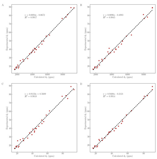 Linear regression fitting of computed 13C NMR chemical shifts of compounds 1 (A,C) and 2 (B,D), with experimental values of compounds 1 (A,B) and 2 (C,D).