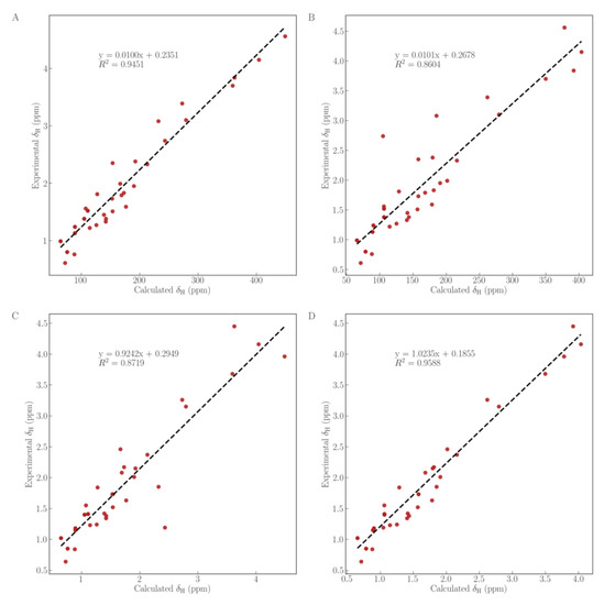 Linear regression fitting of computed 1H NMR chemical shifts of compounds 1 (A,C) and 2 (B,D), with experimental values of compounds 1 (A,B) and 2 (C,D).